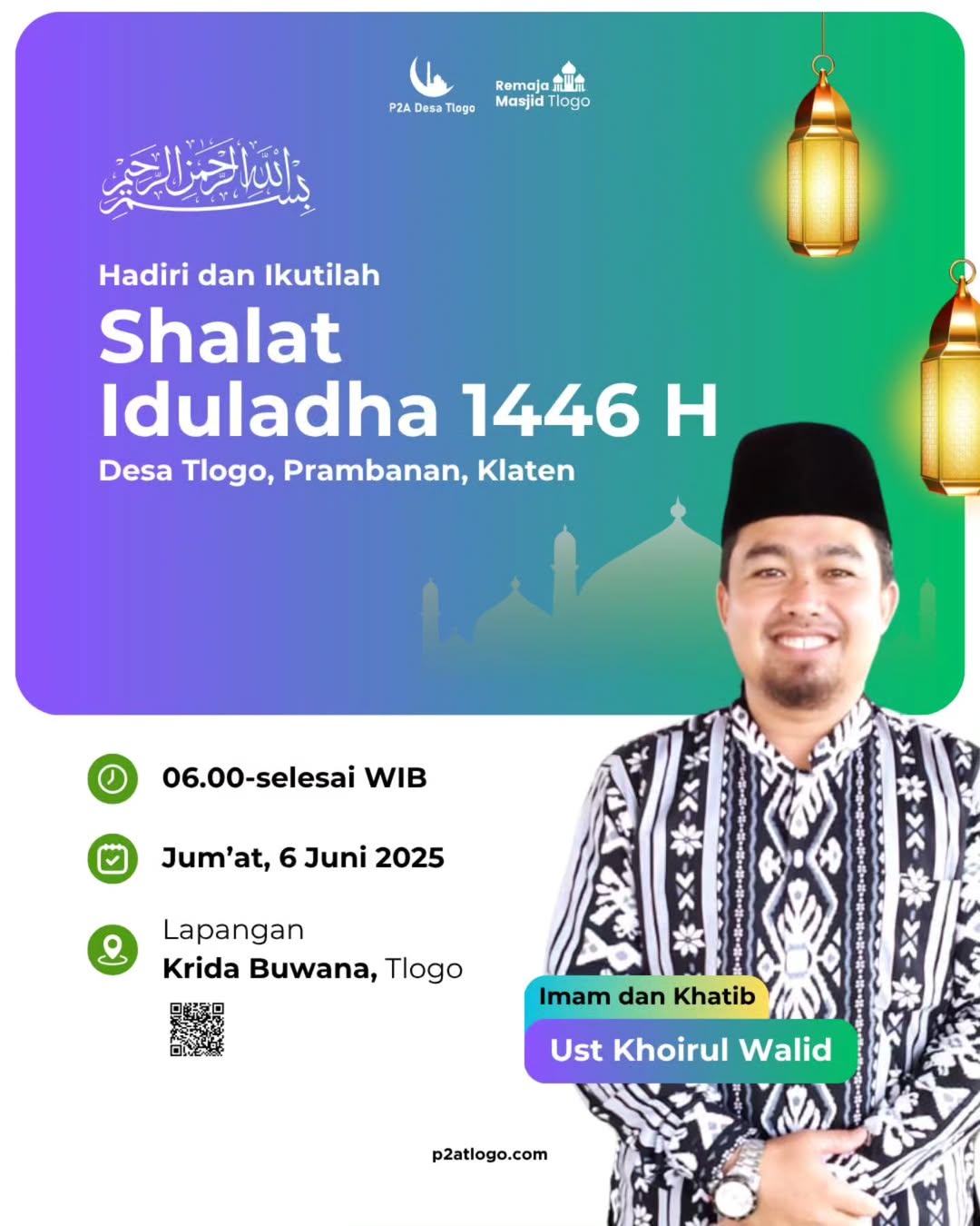 Mengundang jamaah muslim Desa Tlogo dalam Shalat Iduladha 1446 H yang akan diselenggarakan pada:
